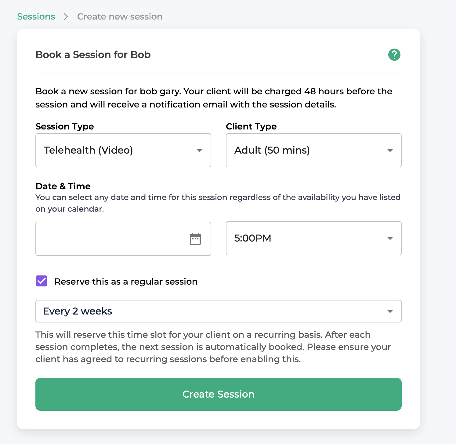 When creating a new booking with a client, you'll see a checkbox labelled "Secure this spot as a regular session" on the date and time step. Tick it, then choose how often you'd like to meet: